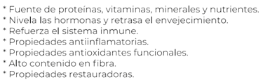 Excelente suplemento alimenticio para regular los niveles de glucosa en la sangre y triglicéridos altos. Fortalece articulaciones, músculos y huesos. Absorbe la grasa de la sangre, limpiando las arterias. Mejora niveles de concentración y retención.