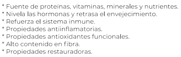 Excelente antioxidante, aumenta la energía, evita el cansancio e insomnio. Reduce el azúcar en la sangre, estabiliza la presión arterial. Fortalece el corazón hígado, riñones y páncreas. Previene la oxidación celular y los síntomas causados por la edad, el cáncer y enfermedades autoinmunes.
